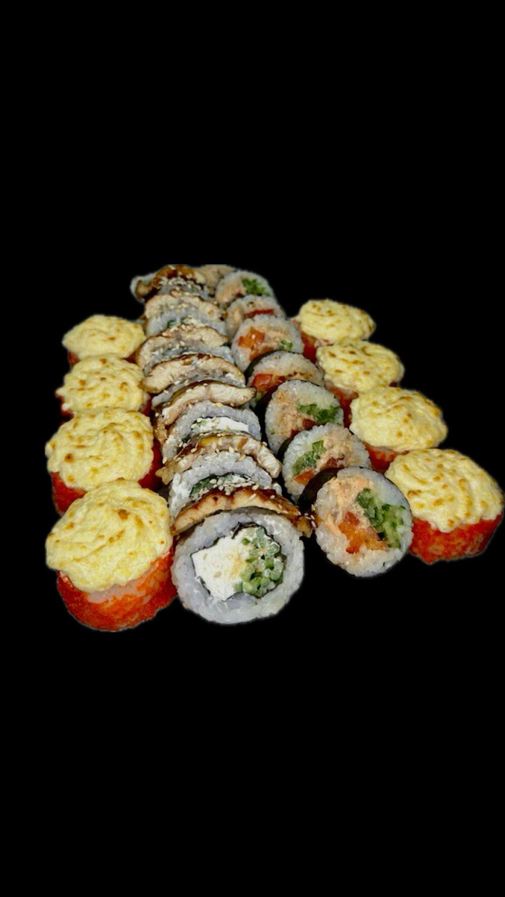 Запеченный с мидиями Филадельфия с угрем Ролл с лососем татаки спайси