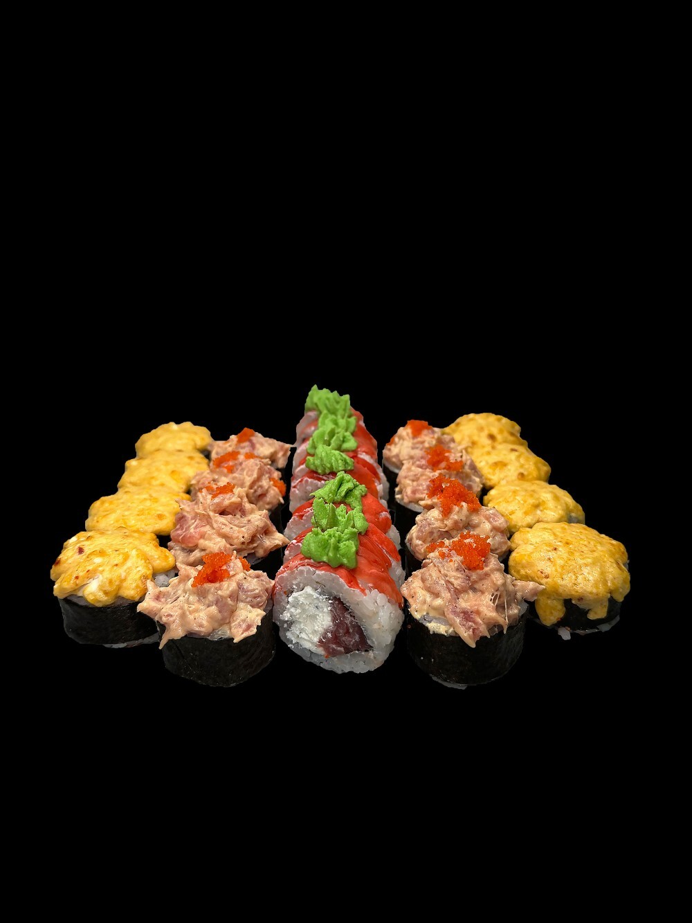 Ролл «БЕЗУМЕЦ» Ролл тартар тунец спайси Ролл запеченный спайси